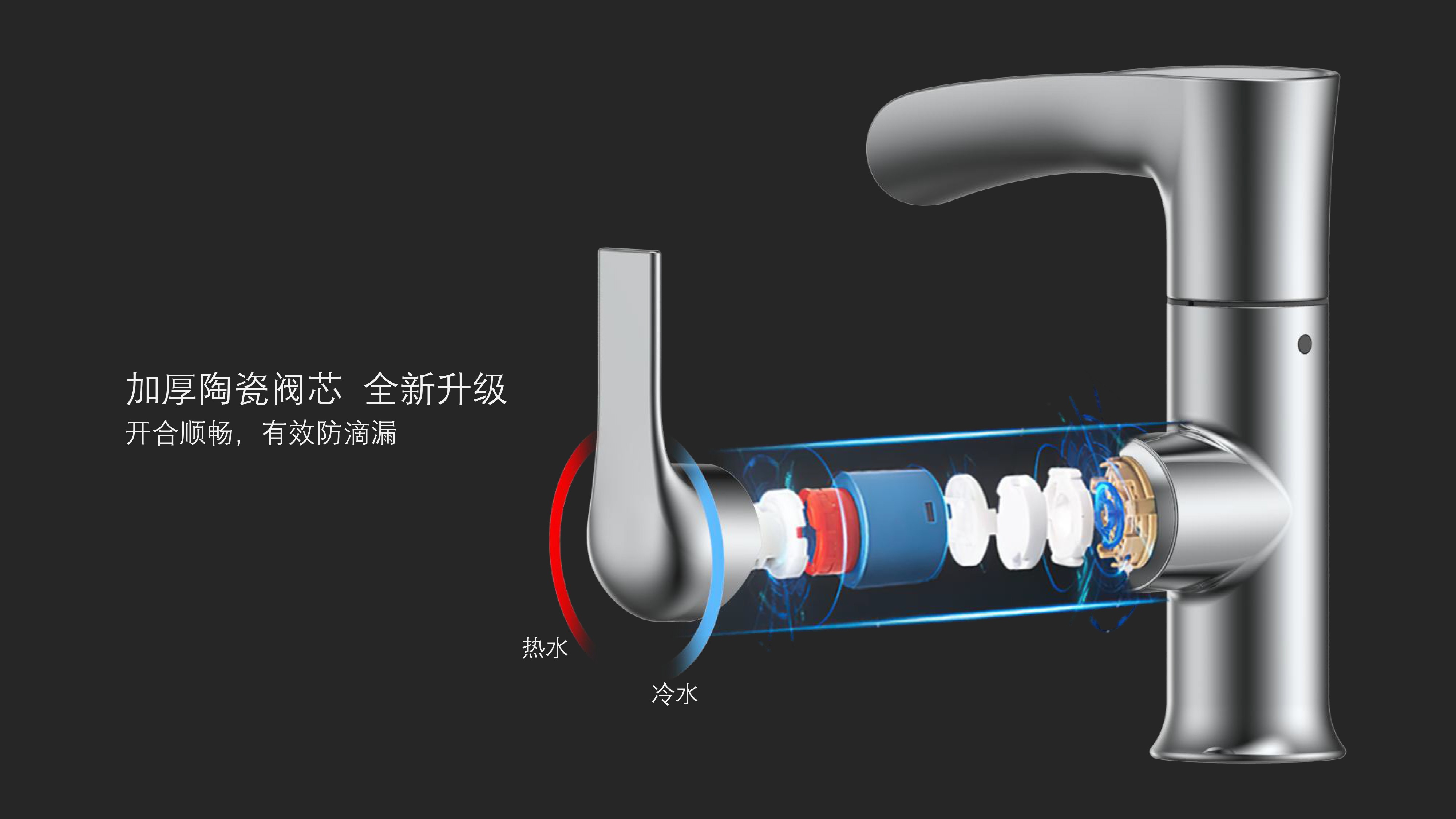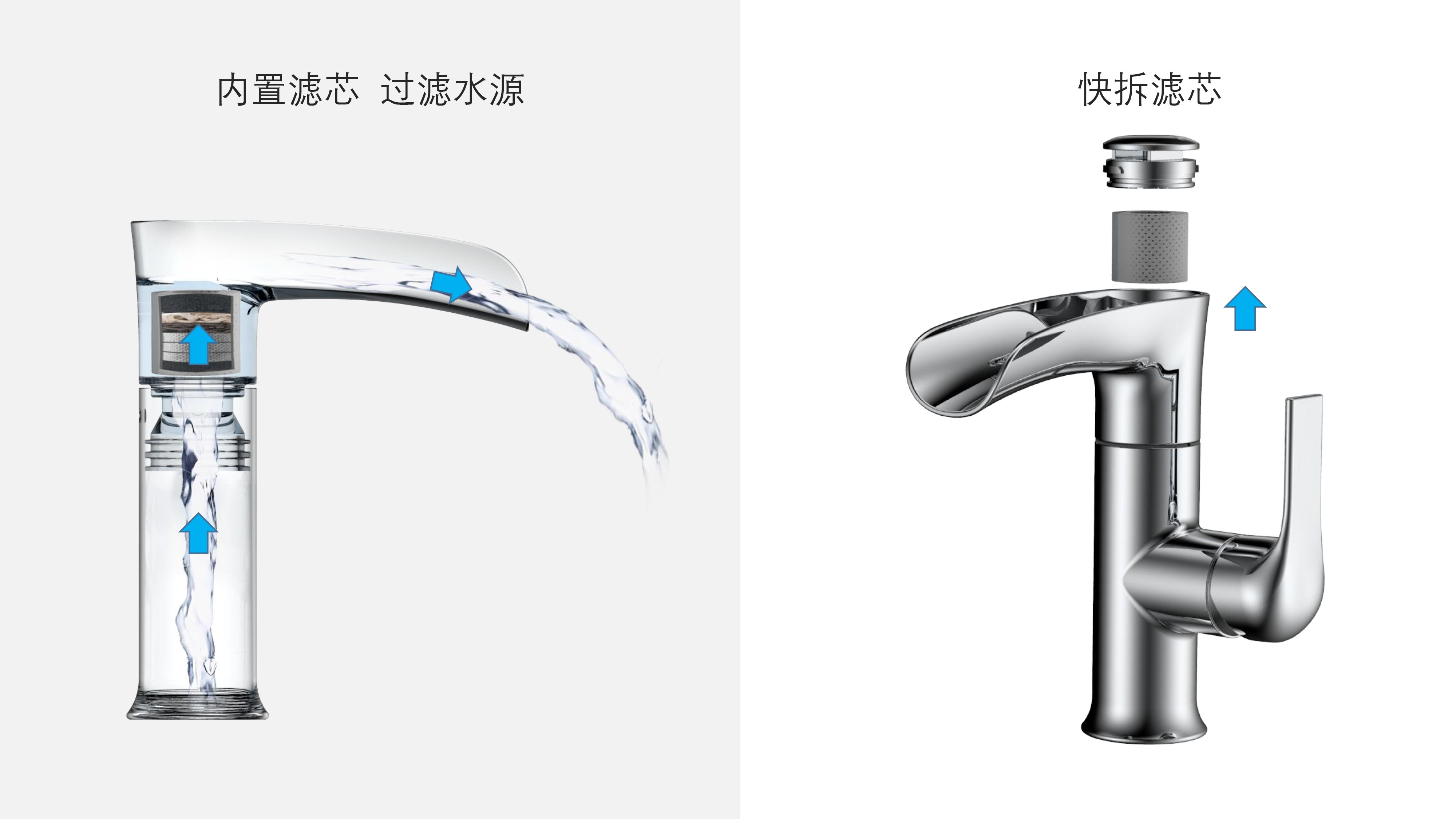 簡約時尚設計;加厚陶瓷閥芯開合順暢,有效防滴漏;內(nèi)置快拆可更換過濾濾芯;